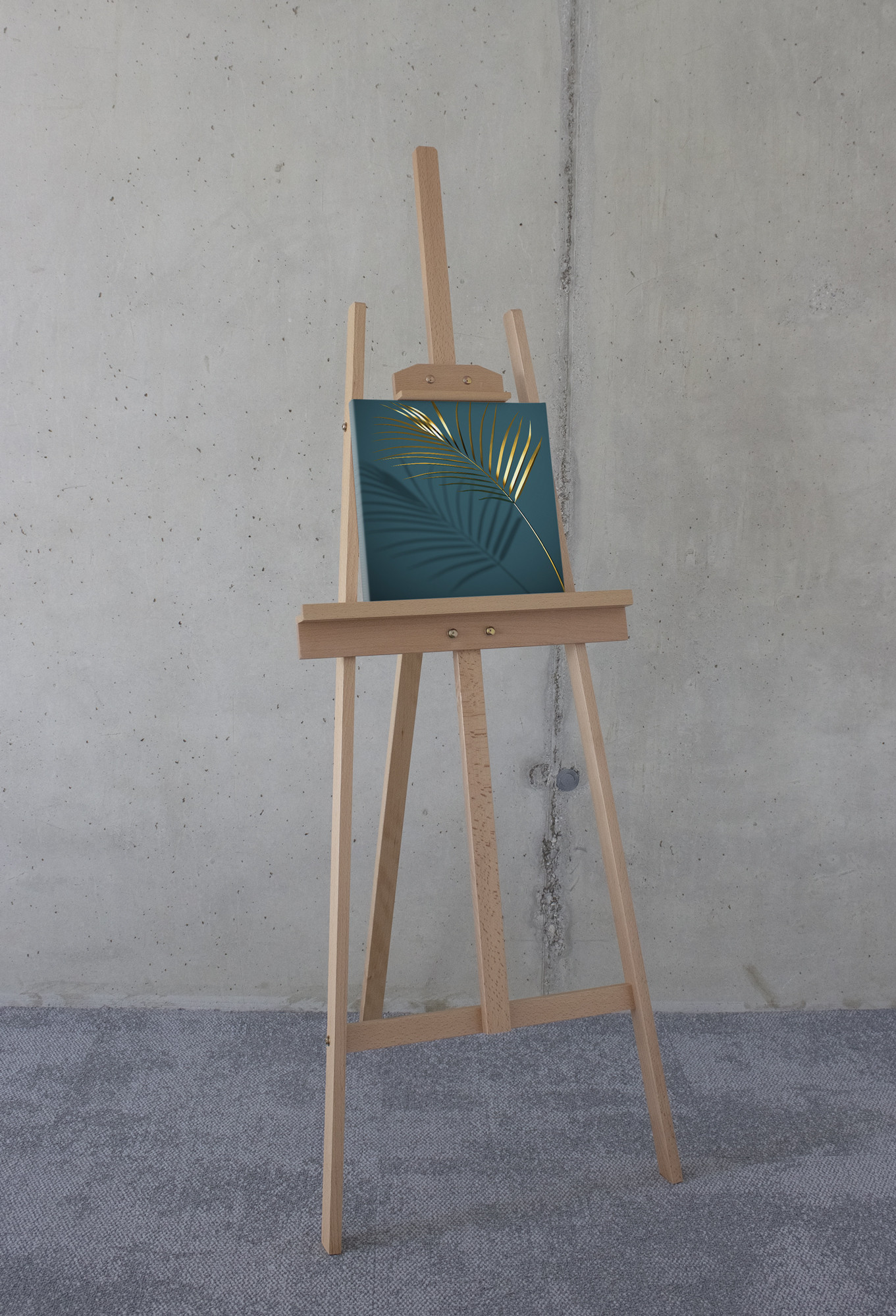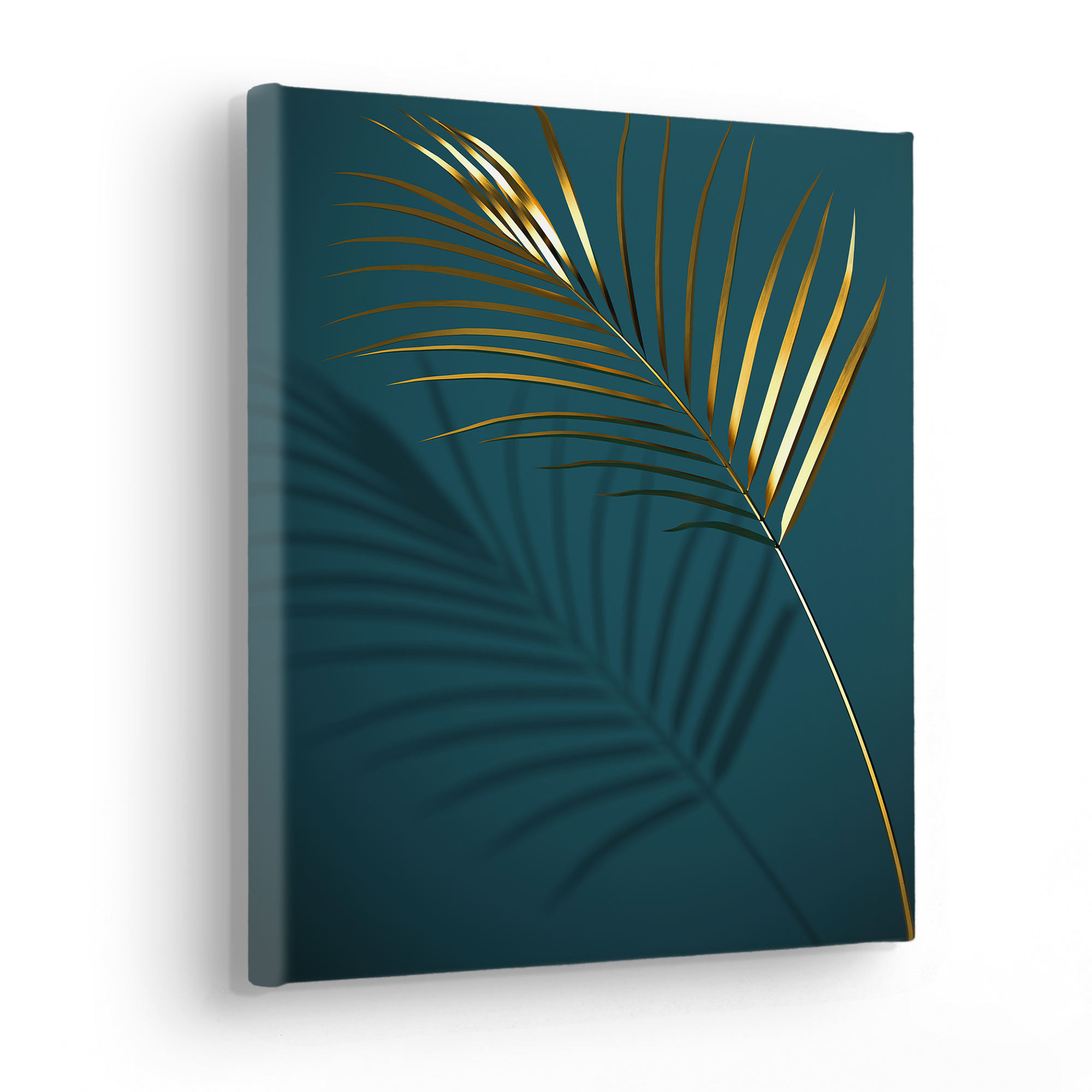 Dieses Palmenblatt wurde in Gold getaucht und wirkt auf dem Hintergrund in Petrol glamourös und wertvoll. Der Schatten verleiht dem Bild Tiefe. Wer seinen Wänden ein optisches Highlight verpassen möchte, der ist mit diesem Wandbild genau richtig.