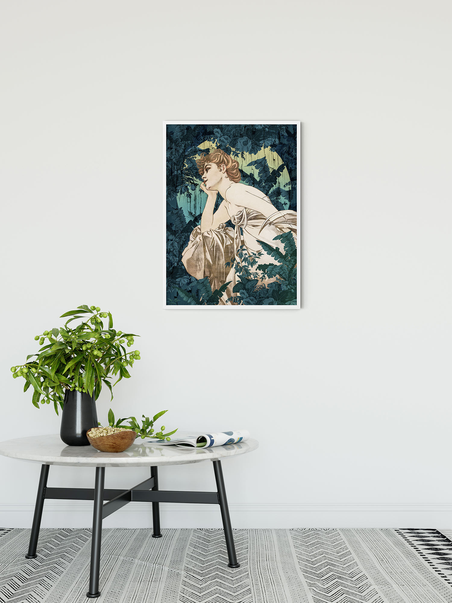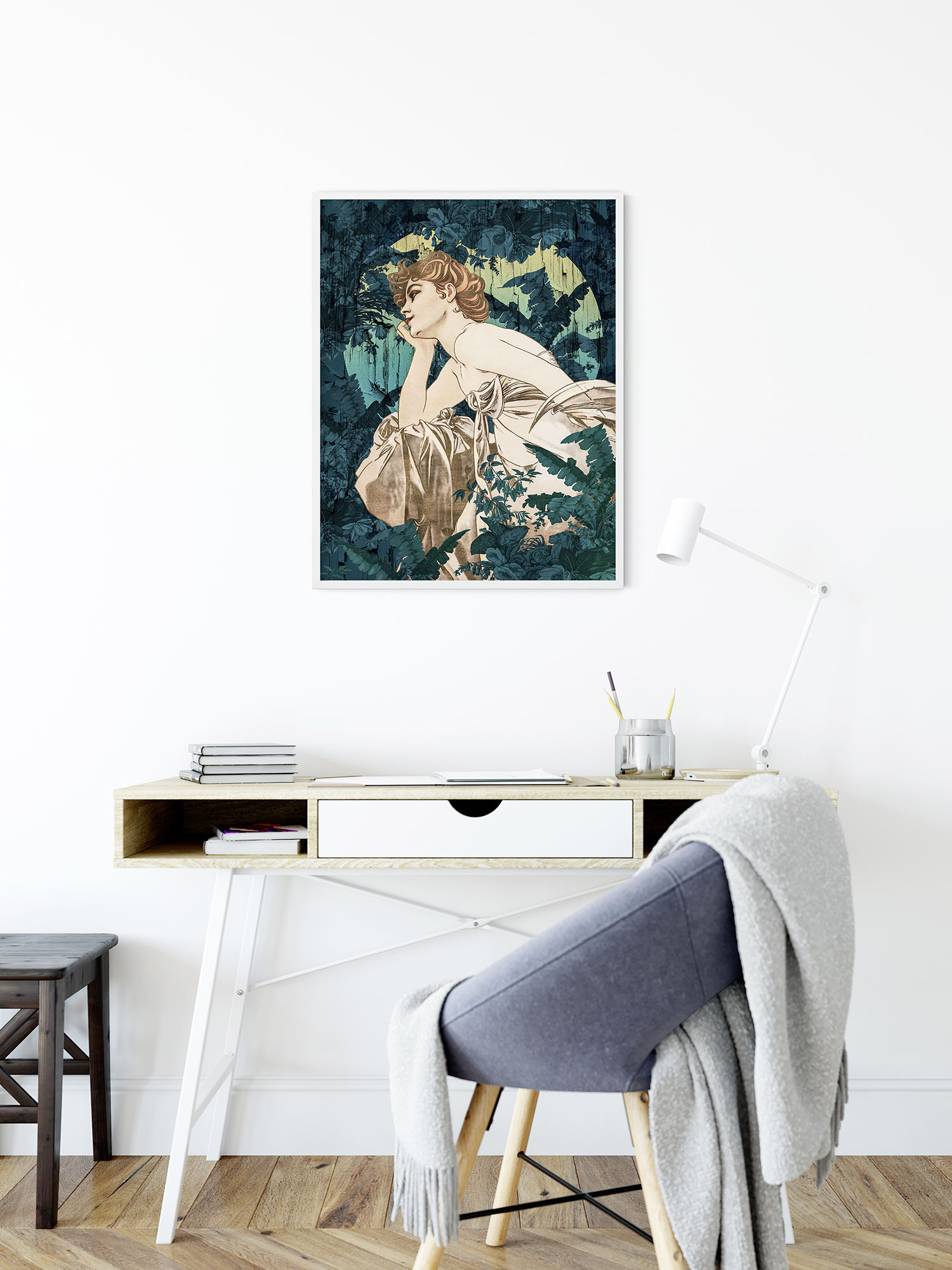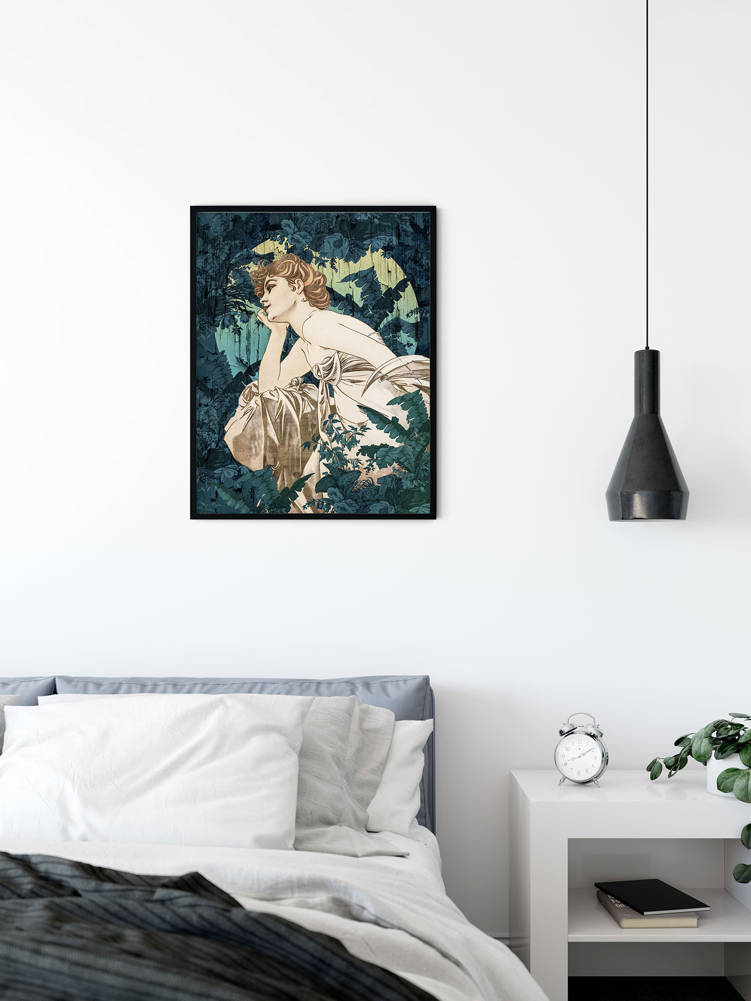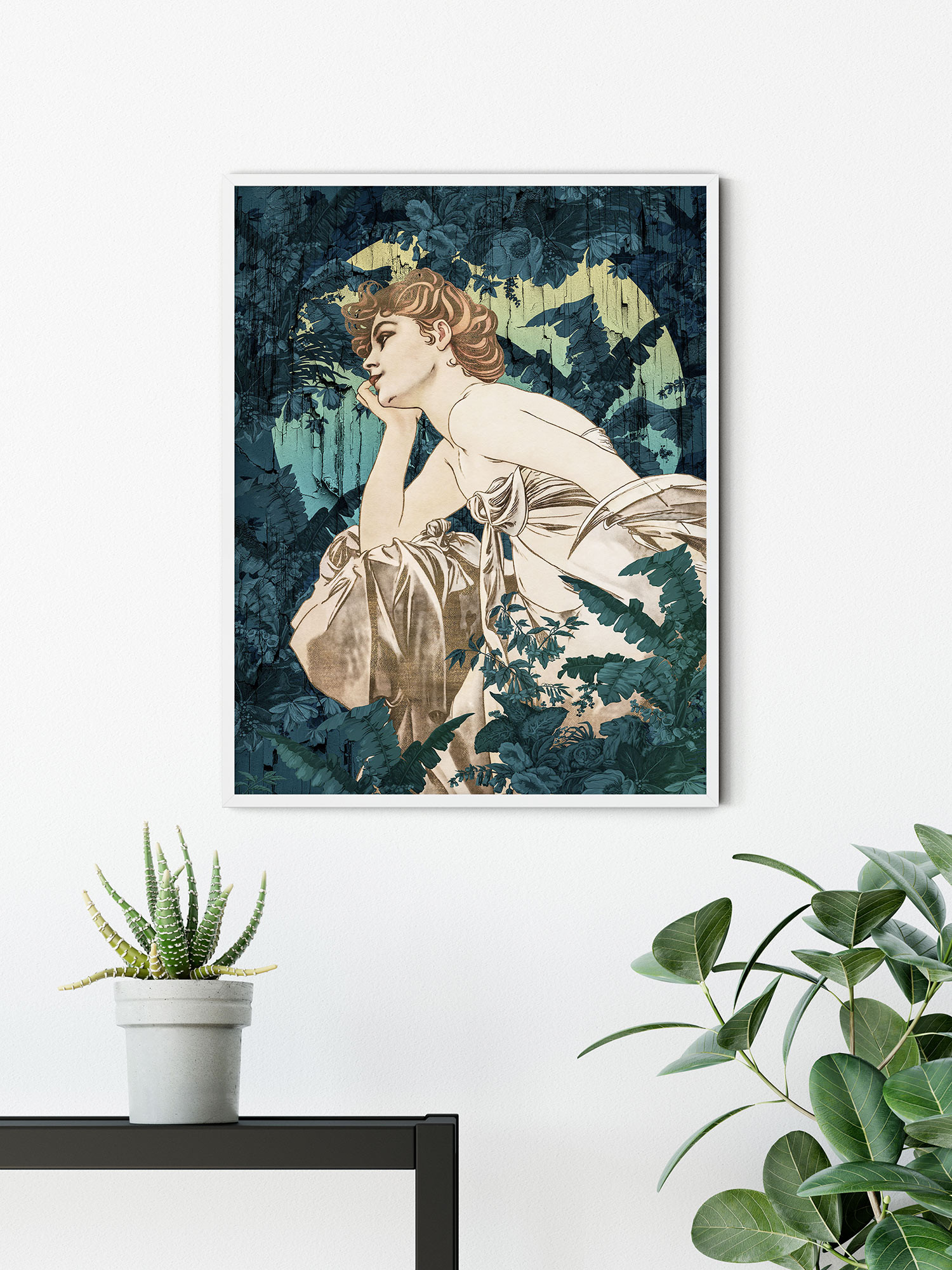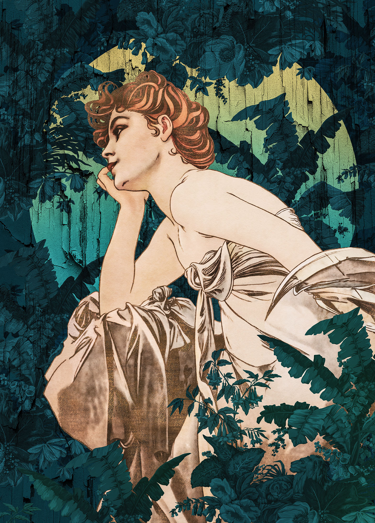 Die schöne Désirée blickt nachdenklich in die Ferne und zieht mit diesem aufregenden Wandbild ihre Betrachter:innen in den Bann. Im Hintergrund scheint der Mond durch die Pflanzenpracht hindurch und hat eine mystische Wirkung.