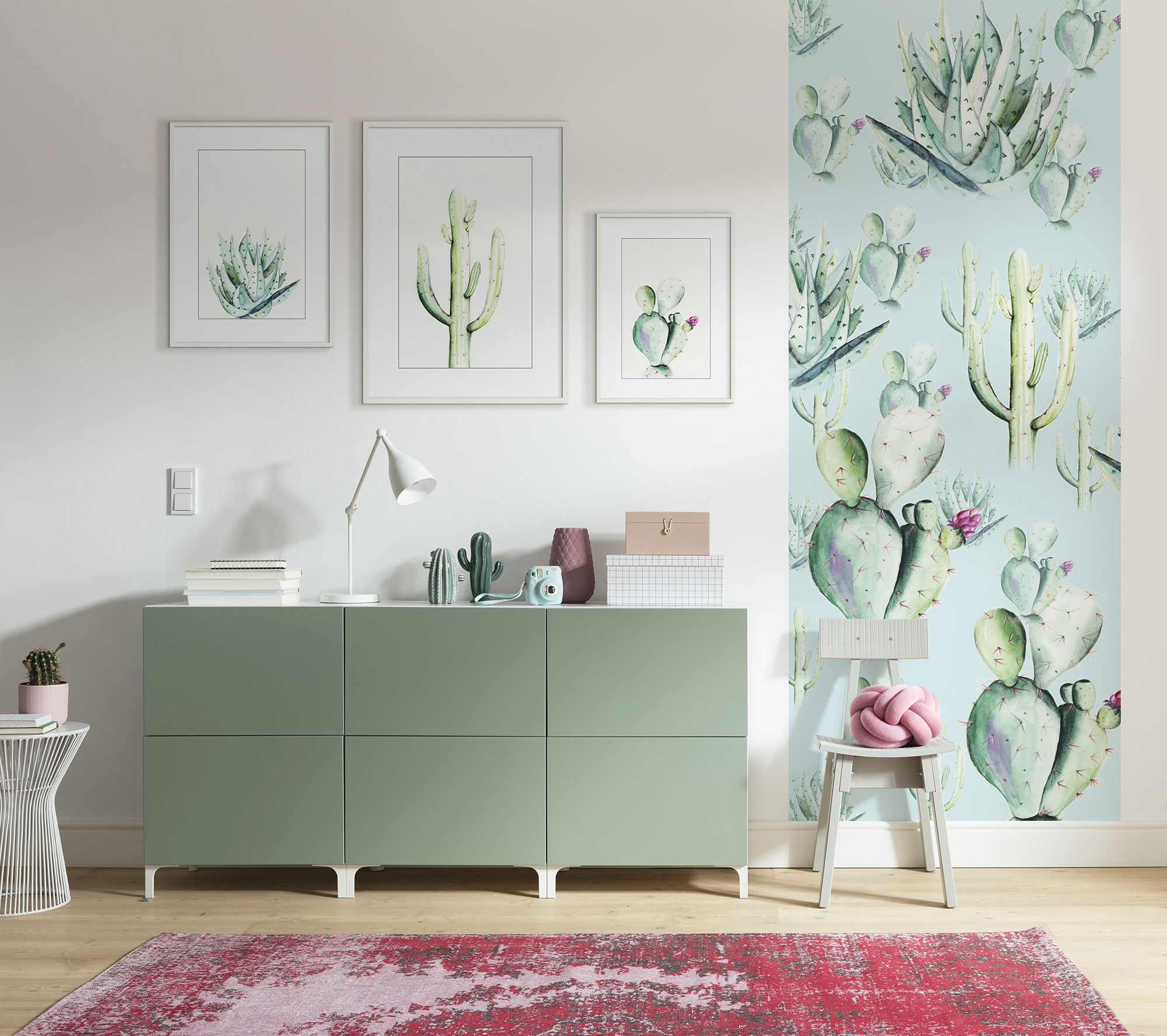 The refreshing mint green of the panel is sure to put you in a holiday mood. This colour is also echoed in the exotic illustrations. The large cactus picture measures 50 x 70 cm and is supplied in a high-quality real wood frame. The accompanying two posters also are supplied in wooden frames (30 x 40 and 40 x 50 cm respectively).