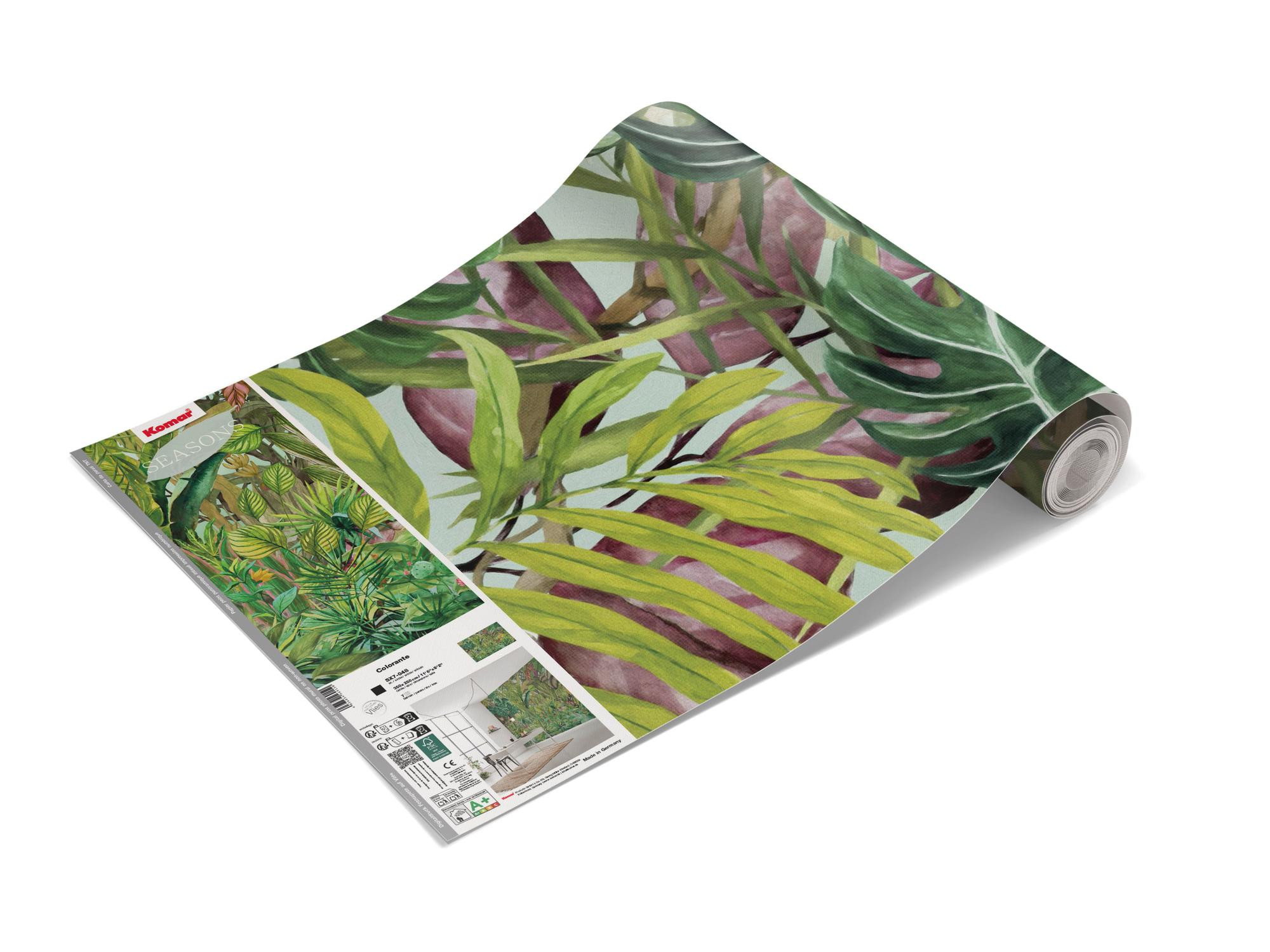 El motivo de palmeras a gran escala muestra sus colores. Los intensos tonos verdes y el moderno rojo burdeos se extienden por las paredes y aportan un toque exótico a las habitaciones. El papel pintado es perfecto para dar un toque personal al entorno.
