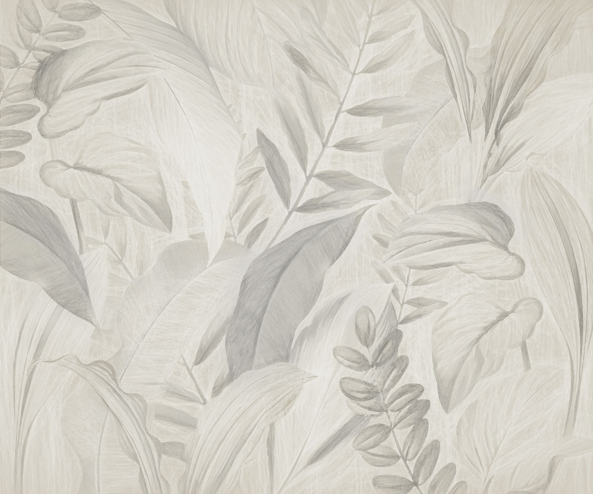 Tonos suaves de greige, delicados trazos y finas estructuras de hojas se extienden por la pared, aportando al espacio una elegancia discreta. La ilustración, de carácter sutil, se integra de forma armoniosa en el entorno sin restarle protagonismo. Aun así, el diseño sigue siendo un punto focal elegante que añade sofisticación a cualquier interior.