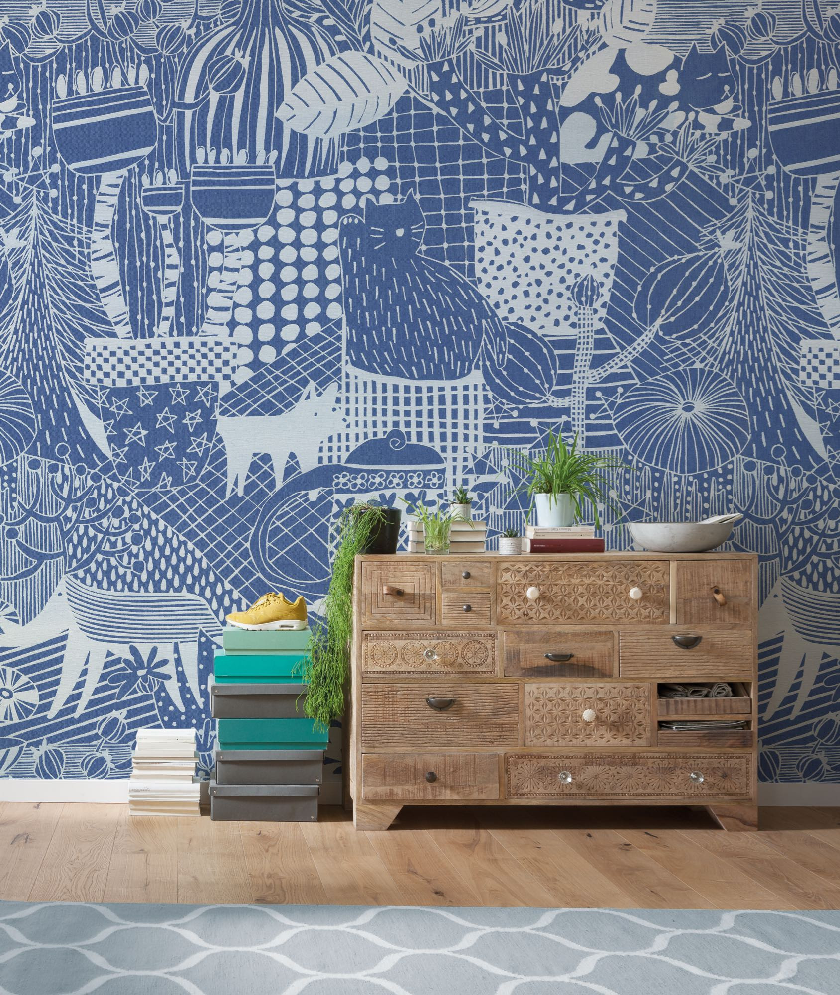 El papel pintado de tejido no tejido presenta un diseño gráfico y alegre con gatos, plantas y patrones geométricos en tonos azul y crema. La ilustración artística aporta al espacio una atmósfera moderna y acogedora. El fuerte contraste crea un punto focal lleno de vida que refleja individualidad y creatividad. Ideal para interiores con personalidad y encanto.