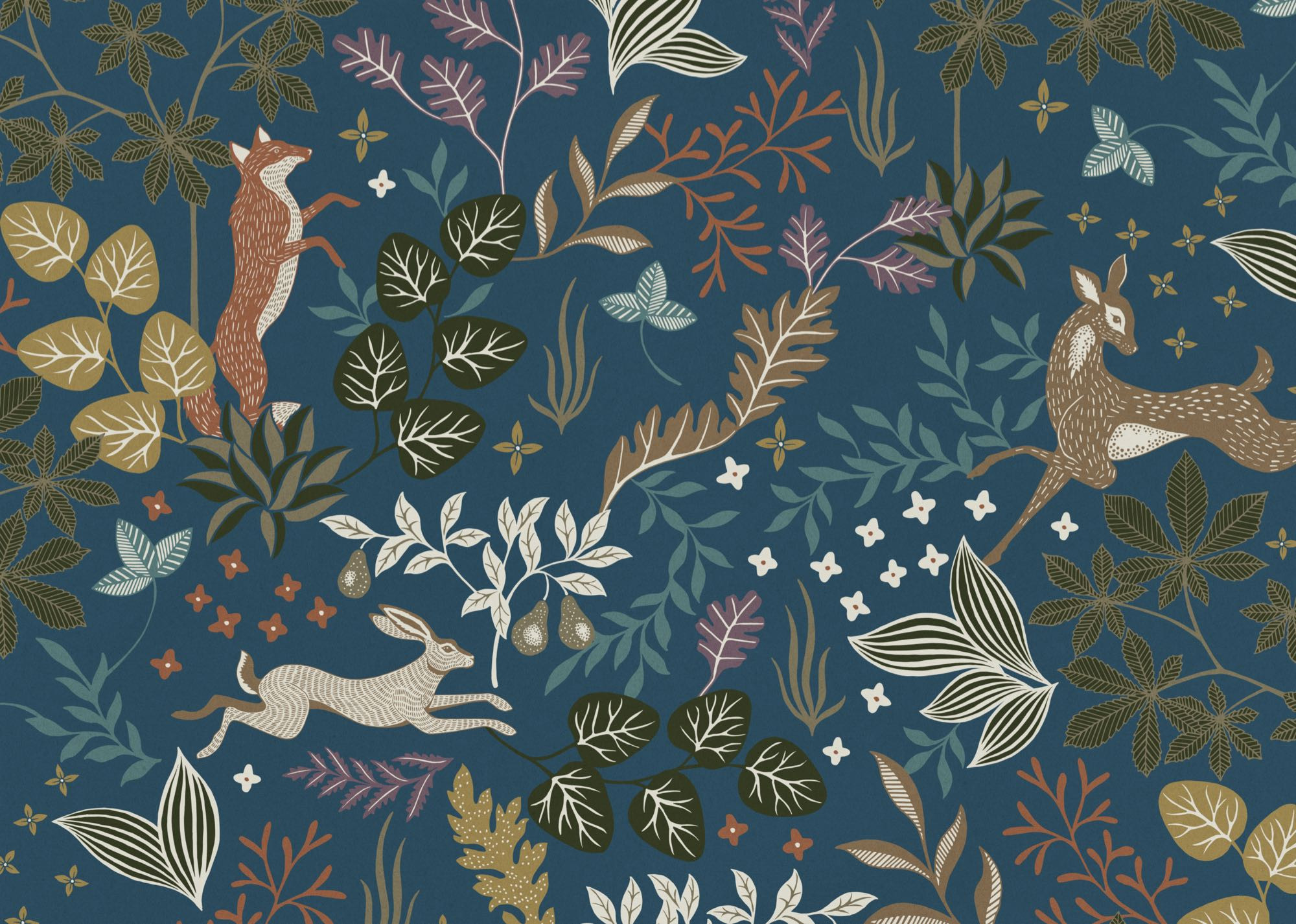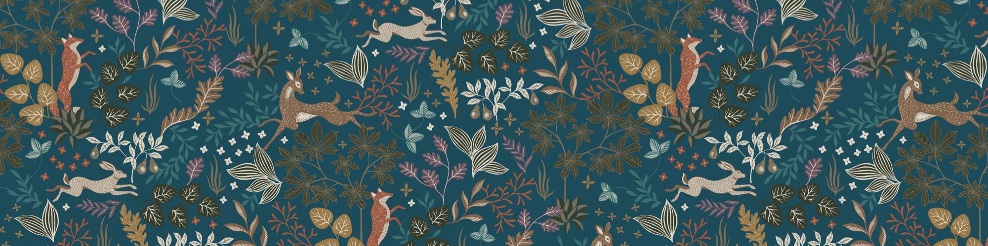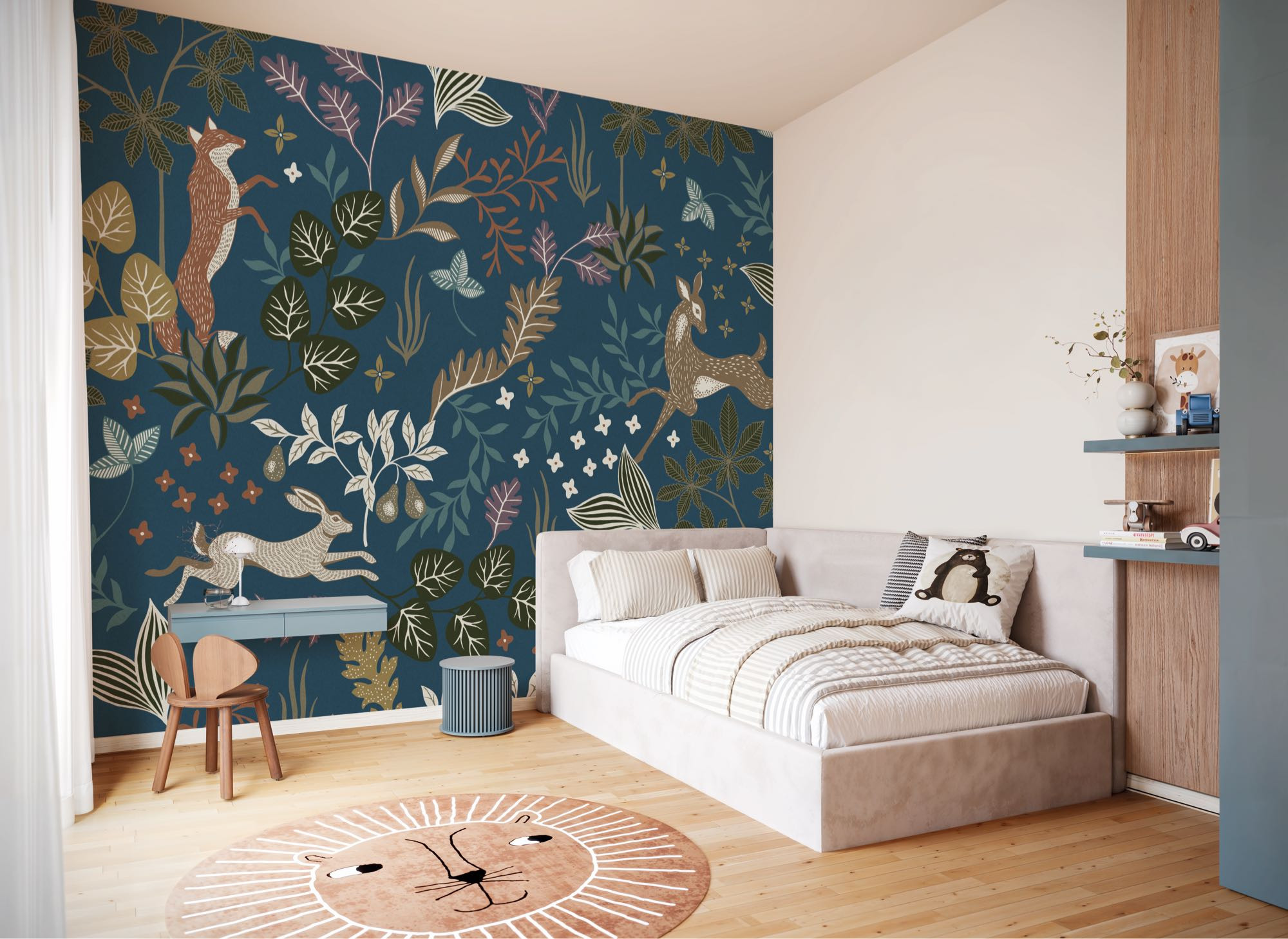 Entre animales del bosque, hojas y una atmósfera suave, es el lugar perfecto para dormir plácidamente. El diseño lleno de cariño de este papel pintado infantil invita a soñar y a jugar. Los tonos naturales y un azul intenso completan el conjunto. Así nace un espacio lleno de ternura donde la imaginación y la calma van de la mano.