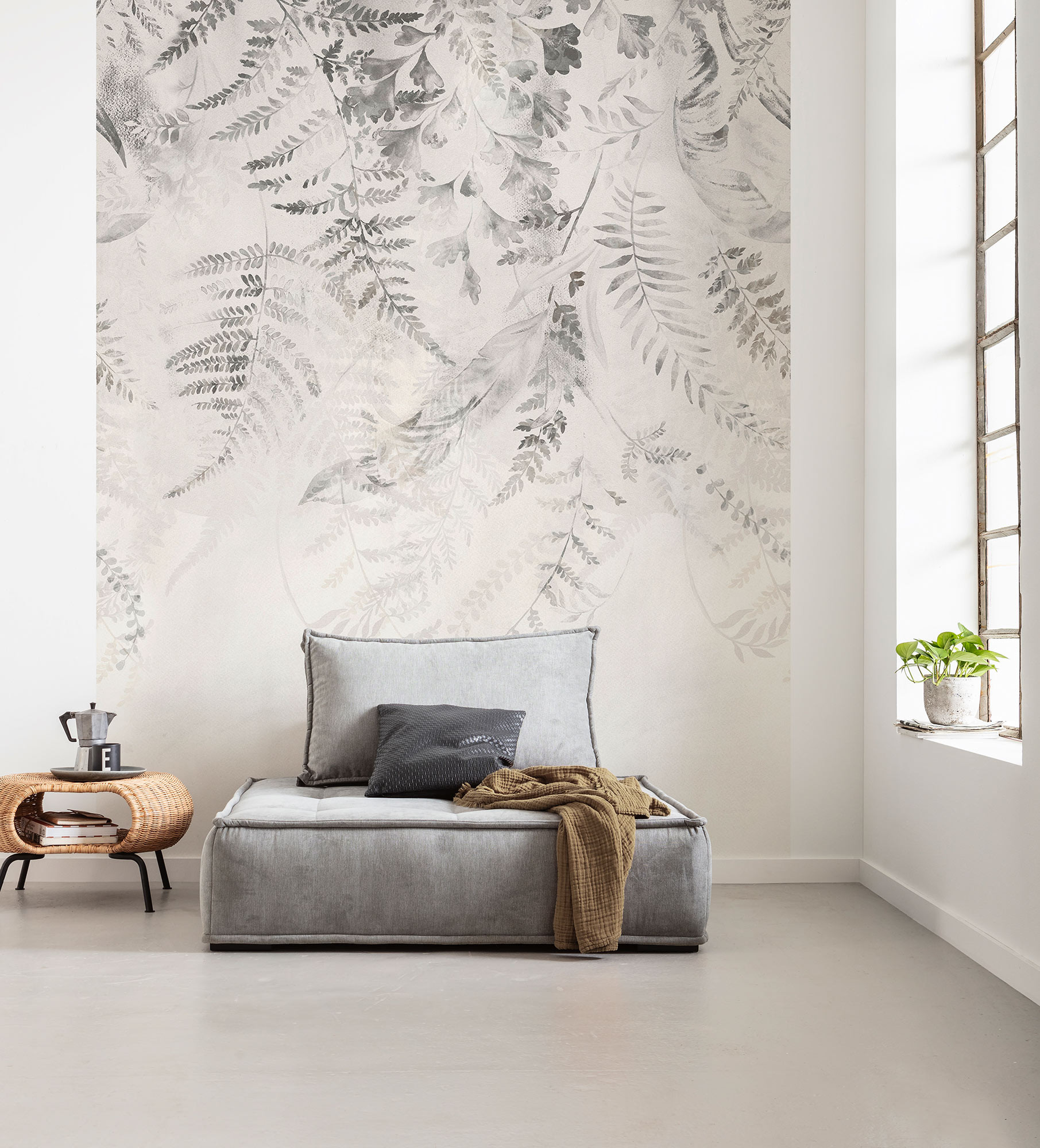Ein Traum in Beige: Zarte Pflanzen ranken sanft von der Decke herab und werden in ihrer Darstellung immer filigraner, je weiter sie nach unten reichen. Eine Tapete, so dezent, dass sie kaum wahrnehmbar ist, aber dennoch eine einzigartige Atmosphäre schafft, die zum Wohlfühlen einlädt.
