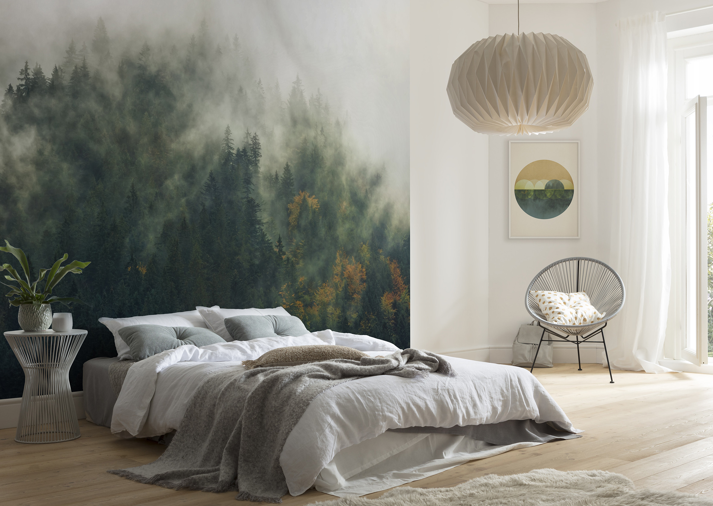 Эти великолепные обои с изображенными на них многочисленными верхушками деревьев дополнены минималистичной картиной в раме в похожей цветовой гамме. Вместе они рождают идеальный дуэт.